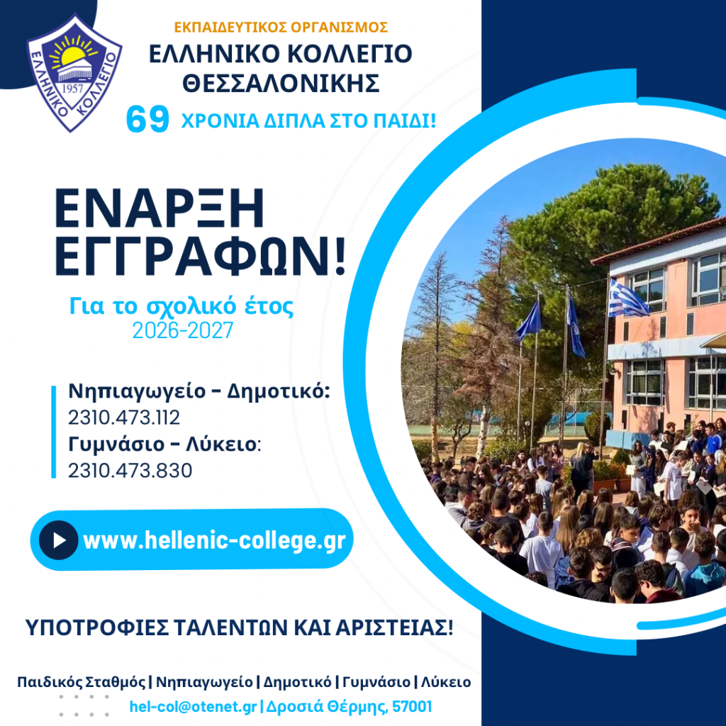Το ΕΛΛΗΝΙΚΟ ΚΟΛΛΕΓΙΟ ΘΕΣΣΑΛΟΝΙΚΗΣ, όπως κάθε χρόνο, θα χορηγήσει υποτροφίες φοίτησης κατόπιν εξετάσεων, σε μαθητές και μαθήτριες που θα αριστεύσουν στο μάθημα της Ελληνικής Γλώσσας...