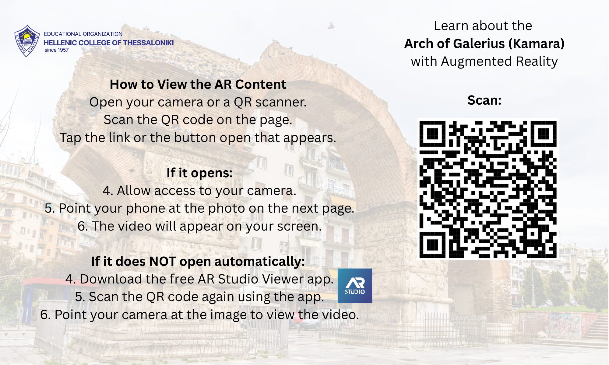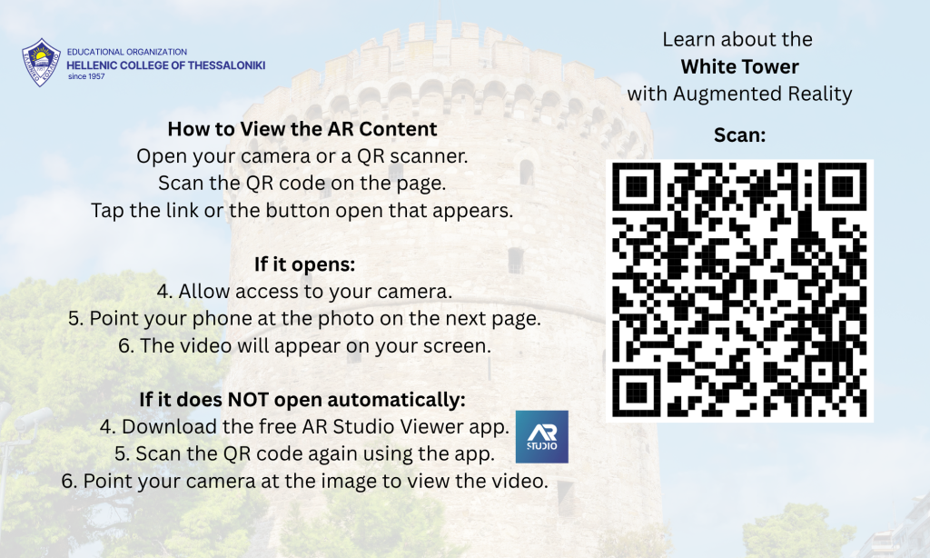The Augmented Reality (AR) experiences were developed by students of the Hellenic College of Thessaloniki on the occasion of their participation in the 7th Annual World Cultural Heritage Youth Symposium 2026, as a member of the UNESCO Associated Schools Network.