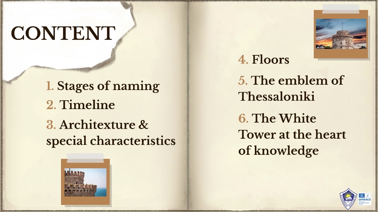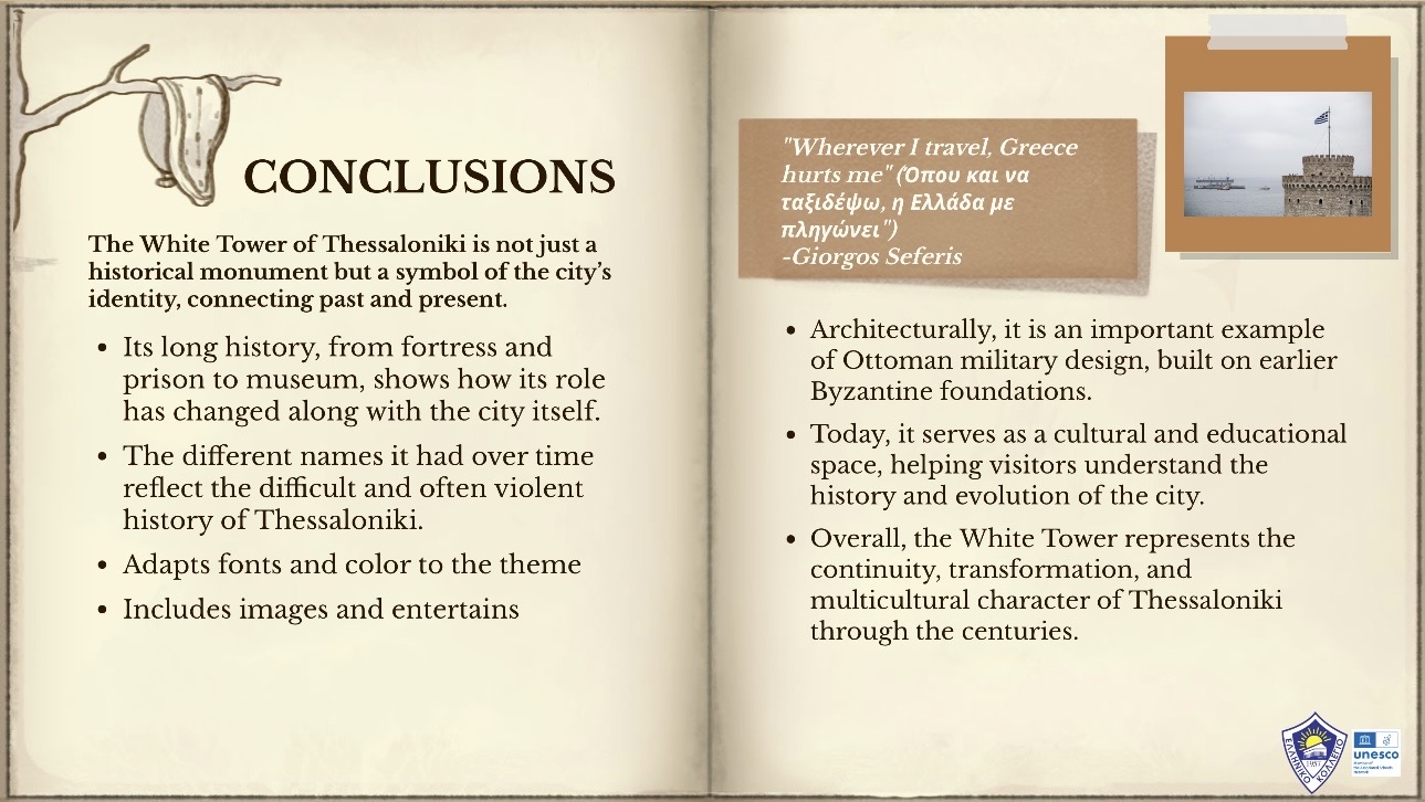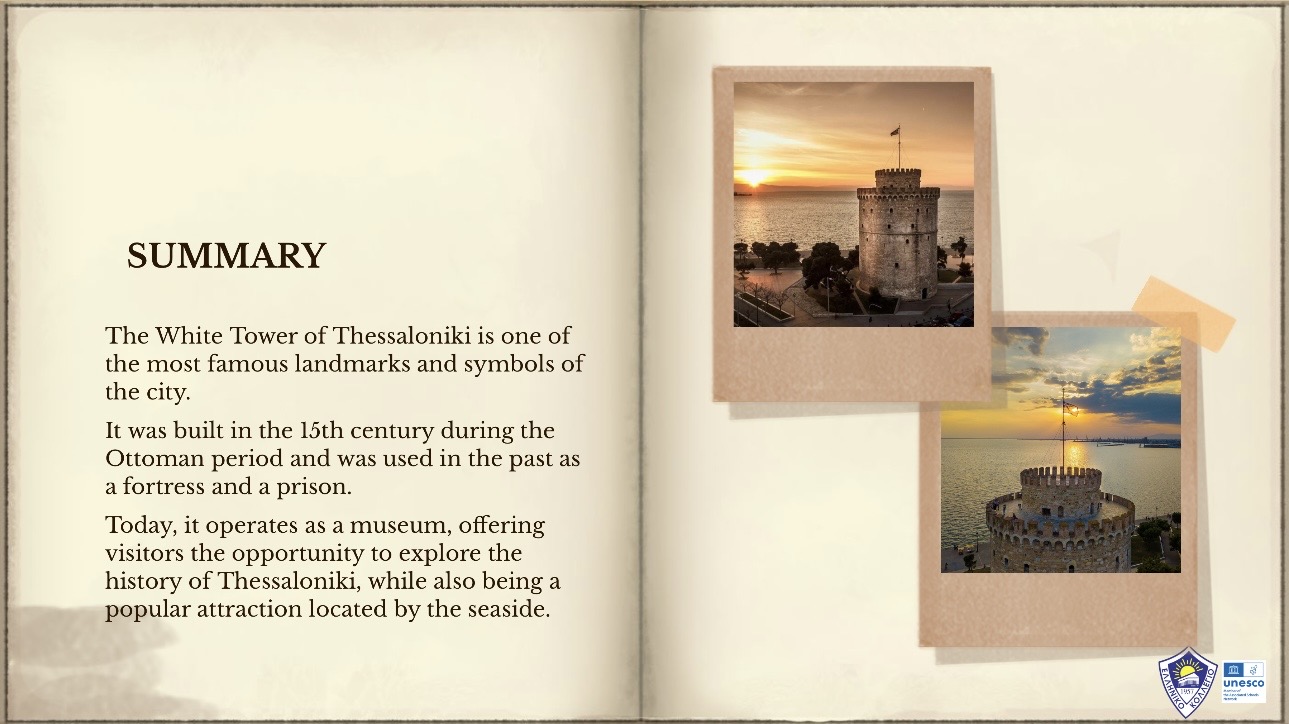 - Two (2) presentations about the two monuments of Thessaloniki, the one about White Tower in Genially & Arch of Galerius in Notebooklm.