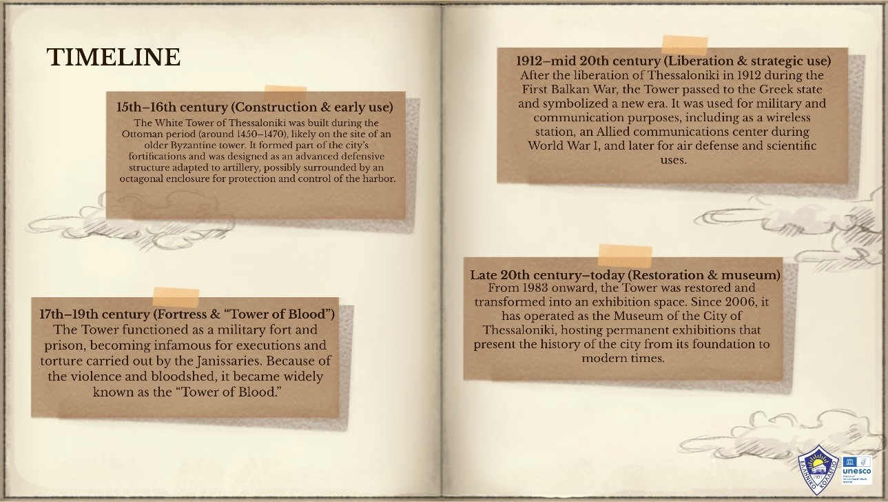Focusing on the historical evolution of the White Tower of Thessaloniki and the Arch of Galerius, the timelines present key events and transformations across different periods. By organizing information chronologically, students provide a clear narrative of how these landmarks have changed over time, offering users a deeper understanding of their enduring presence in the city.