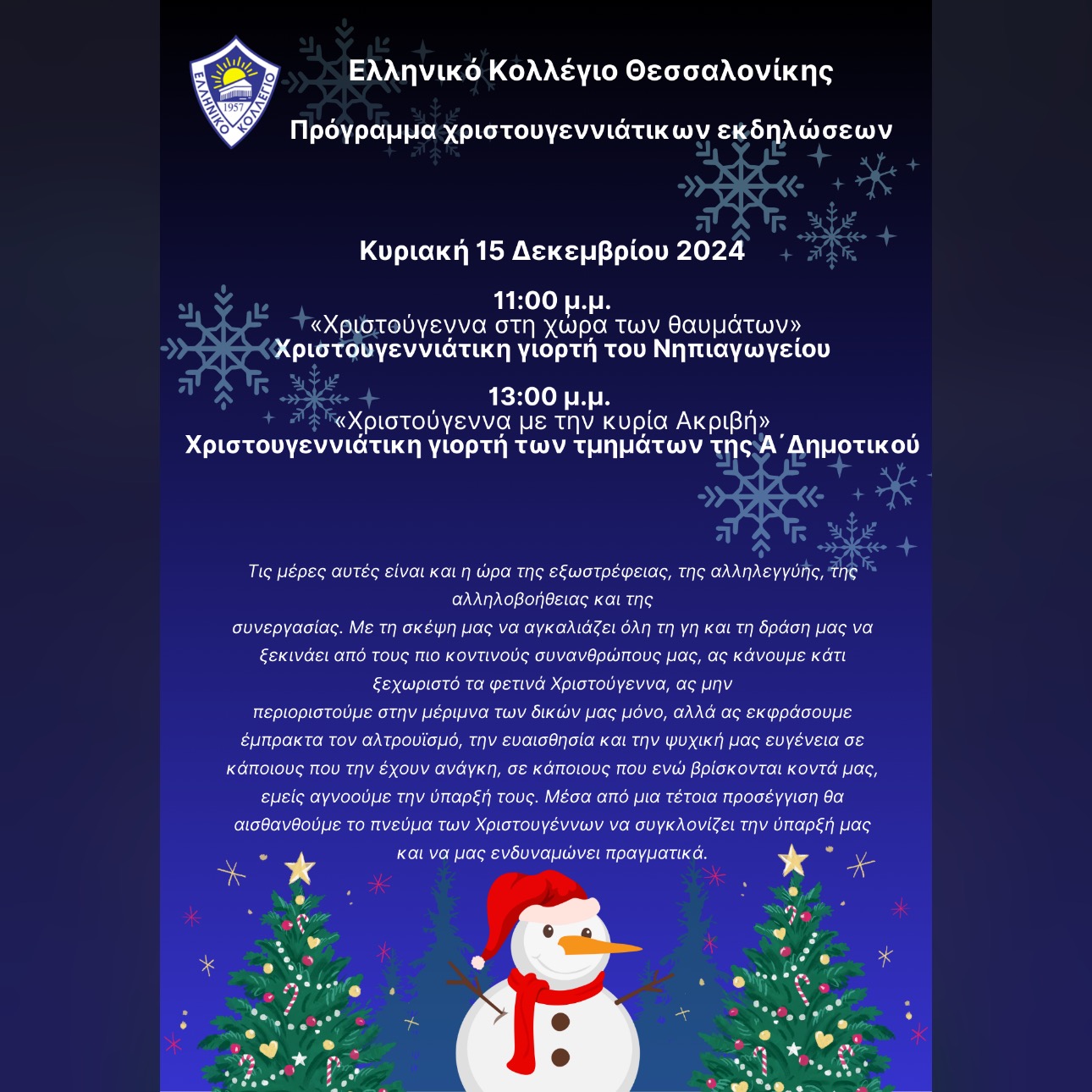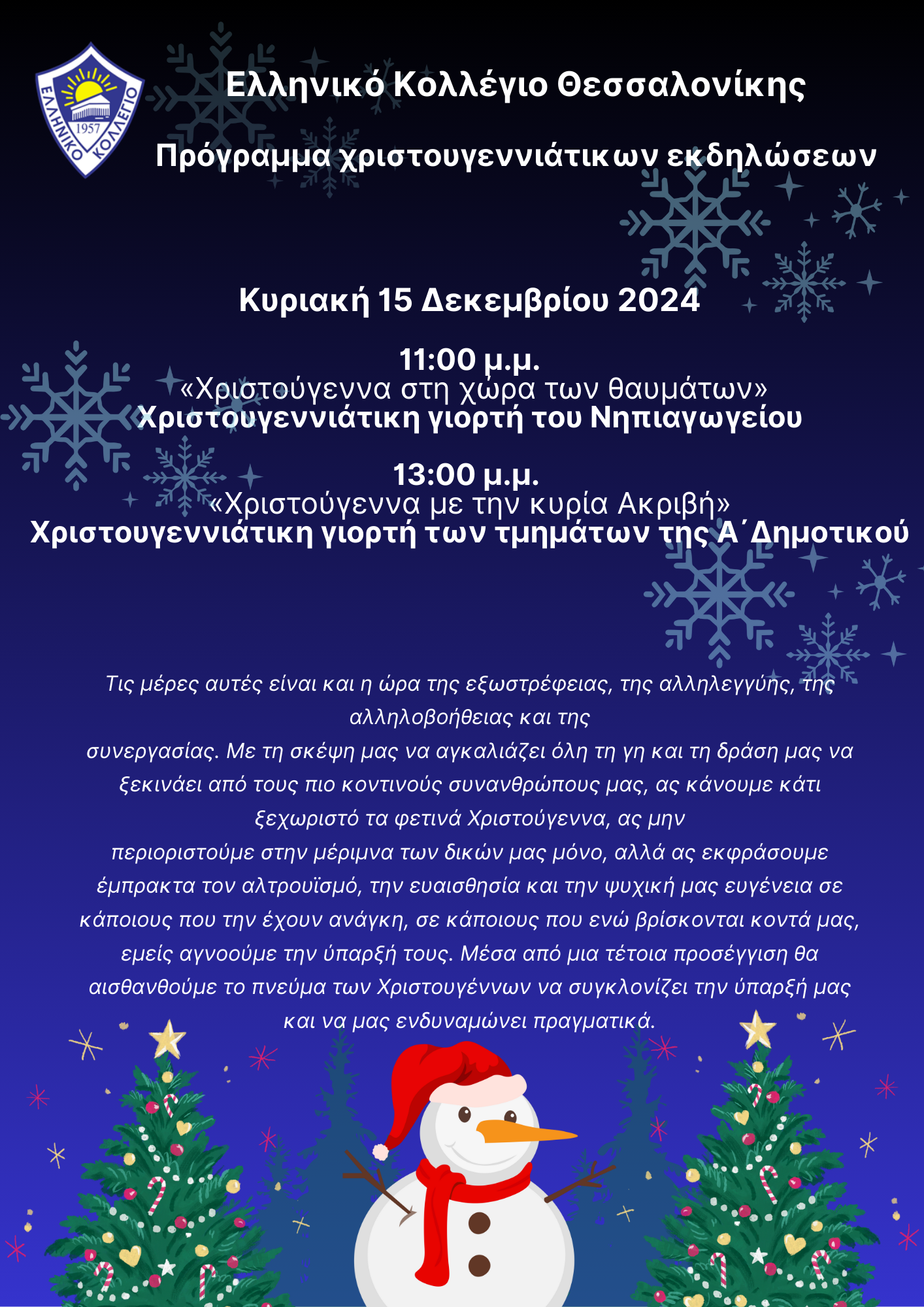 Ανακοινώσεις, Εκδηλώσεις, Νέα Πρόγραμμα Χριστουγεννιάτικων Εκδηλώσεων 2025 14/12/2024 14/12/2024 Ανάρτηση από helleniccollege 14 Δεκ 2024