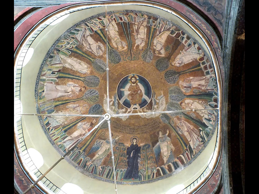 Στο εσωτερικό του ναού υπάρχουν τρία κλίτη με εναλλασσόμενους κίονες και πεσσούς. Ο ναός διακρίνεται για τη ζωγραφική του διακόσμηση, τα ψηφιδωτά και τις τοιχογραφίες που ανήκουν όμως σε διαφορετικές εποχές. Το πιο σημαντικό ψηφιδωτό είναι αυτό της Ανάληψης στον τρούλο που χρονολογείται γύρω στα 880 αντιπροσωπεύοντας την αναγέννηση της ζωγραφικής μετά την Εικονομαχία με κυρίαρχη την έντονη εκφραστική τεχνοτροπία: στην κορυφή υπάρχει παράσταση του Χριστού μέσα σε μια πολύχρωμη ¨δόξα" , την οποία κρατούν δύο άγγελοι και γύρω μια σύνθεση με την Παναγία ανάμεσα σε δύο αγγέλους καθώς και τους Αποστόλους. Επίσης ένα άλλο εξίσου σημαντικό ψηφιδωτό του 11 με 12 αι., που βρίσκεται στην καμάρα του ιερού, απεικονίζει την Παναγία ένθρονη να κρατά στα χέρια της τον Χριστό.